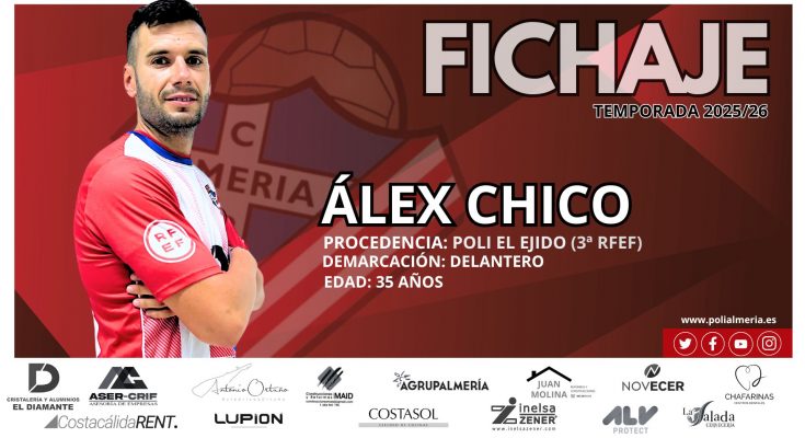 Álex Chico, 36 años, delantero (Adra), se convierte en nuevo jugador del Poli Almería. El delantero abderitano, ha dado el si a la Dirección Deportiva, y estará a las ordenes de Juandi Sánchez la temporada 2025/2026. Otro fichajazo top para el equipo, sin duda este año se está haciendo un esfuerzo importante.