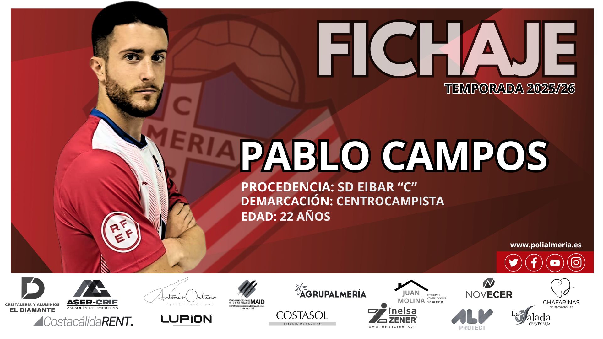 Pablo Campos, 22 años, centrocampista (El Ejido), se convierte en el nuevo fichaje del Poli Almería. Pablo juega de interior izquierda, y llega procedente de la SD Eibar «C» (Tercera RFEF), donde ha jugado las dos ultimas temporadas.